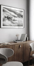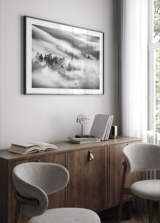 Untitled by photographer Johnny Zhang captures a tranquil, monochrome winter scene: mist-swept mountains fading into cloud, a hush of snow on dark pines, and a veil of fog drifting through the forest. Hazy contours and soft light create a serene, minimalist mood that invites quiet reflection. A calm focal point for any space.