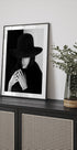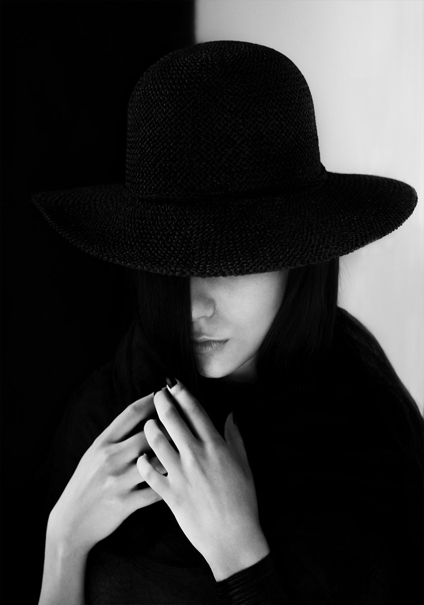 An enigmatic black-and-white studio portrait by Bobby Kostadinov: a woman tilts beneath a wide-brim hat, her hands shielding her gaze as light carves crisp contrasts across fabric and skin. Bold negative space and yin-yang balance create a chic, cinematic mood—mystery, poise, and timeless monochrome allure.