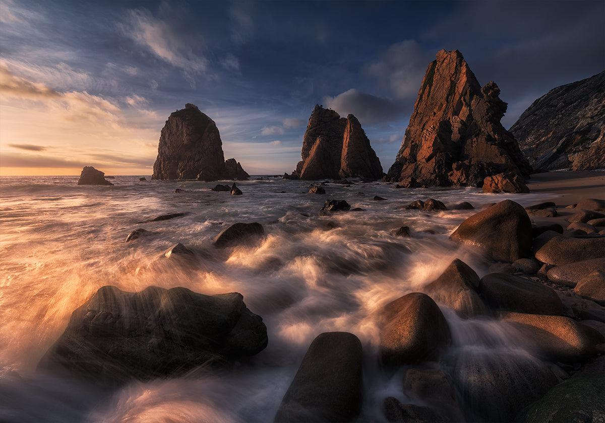 Discover the raw Atlantic drama of Portugal’s Ursa Beach in this atmospheric seascape by artist Carlos F. Turienzo. Needle-like sea stacks cleave the surf, cliffs glow at dusk, and rolling waves lace the sand with foam. A moody, cinematic vista that distills coastal power and twilight calm. Perfect for lovers of rugged shores and golden-hour light.