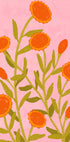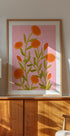 Radiate joy with this playful floral art by Aliya Putrus: stylized orange and red blooms dance atop graphic green stems against a soft pink backdrop. Clean lines and hand-drawn texture give it a mid-century modern feel, brimming with vibrant color and retro, cheerful energy. Perfect for kitchens, studios, or any space that craves sunshine.