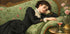 A graceful and timeless artwork portraying a woman in Victorian attire resting on a floral green chaise lounge. Her elegant black dress with lace details contrasts beautifully with the delicate pastel background. A single martini glass on the ornate side table adds a touch of modern sophistication to the classical scene.