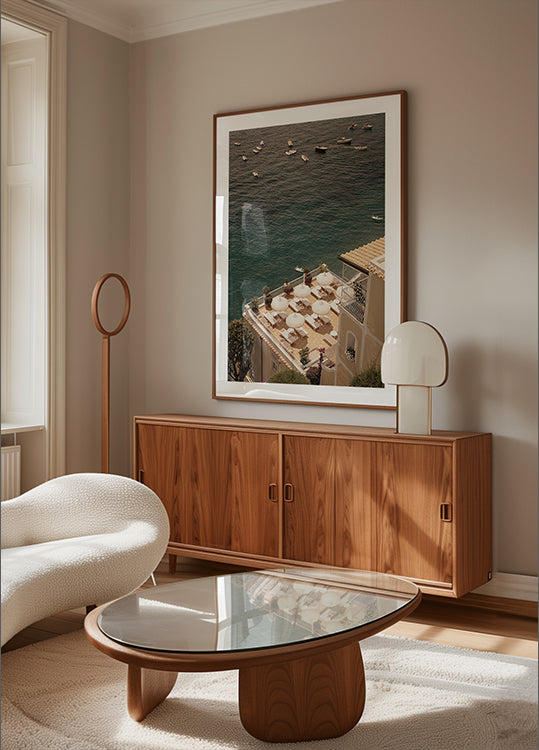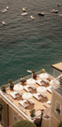 A dreamy coastal photograph capturing the elegant charm of the Amalfi Coast. White parasols and sunbeds line a terrace overlooking the turquoise sea dotted with boats, creating a timeless Mediterranean summer scene. Perfect for bringing warmth, elegance, and a hint of la dolce vita into any space.