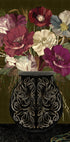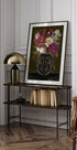 Vintage bouquet by artist Josie George celebrates botanical elegance: soft blue blossoms and blush roses mingle with sunny accents, vine curls, and lush green leaves. Against a deep backdrop, tropical fronds frame the arrangement, blending vintage charm with serene island mood and romantic, garden-poised grace.