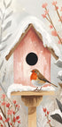Ein stimmungsvolles Wintermotiv: Ein hölzernes Vogelhaus, mit frischem Schnee bedeckt, bietet einem leuchtend roten Rotkehlchen Schutz. Zarte Zweige mit Beeren und grünen Nadeln rahmen die Szene, während sanfte Flocken fallen. Ein ruhiger Moment der Natur, ideal für weihnachtliche Gemütlichkeit und Tierliebe.