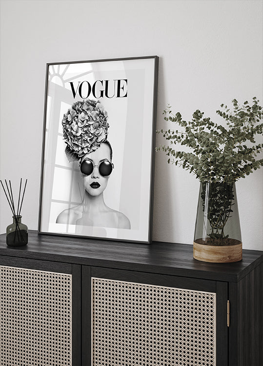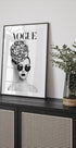 A striking black-and-white fashion-inspired artwork featuring a stylish woman wearing oversized sunglasses and an extravagant floral headpiece. The bold contrast and elegant composition capture high-fashion aesthetics with a modern, sophisticated edge. A perfect statement piece for fashion lovers and chic interiors.