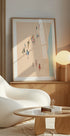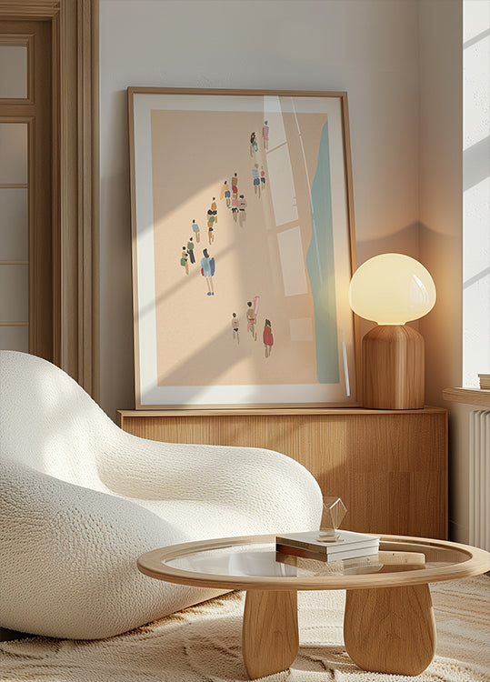 A delicate, minimalist painting showing beachgoers making their way toward the shore, rendered in soft pastel hues. With its simple forms and breezy color palette, this artwork captures the peaceful anticipation of a summer day by the sea — ideal for beach house or seasonal wall decor.