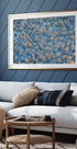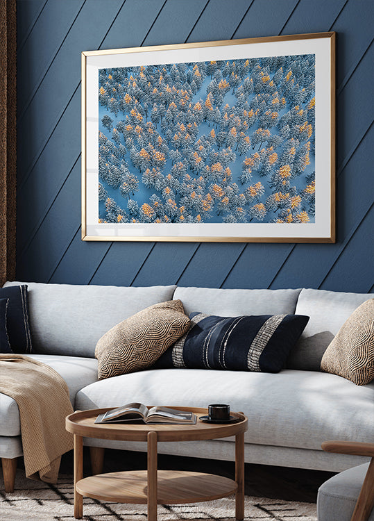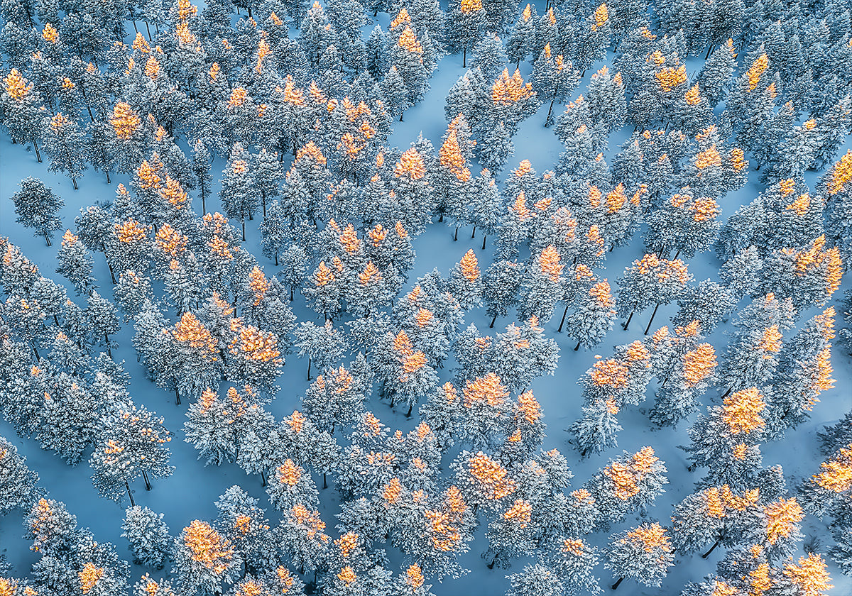 An ethereal aerial scene by Mei Xu: frosted treetops form a delicate tapestry of blues and whites, where winter light softens the forest into abstract geometry. Snow-laden pines radiate quiet energy, inviting a moment of calm as paths and shadows weave a subtle rhythm through the frozen woods. A serene centerpiece for modern spaces.