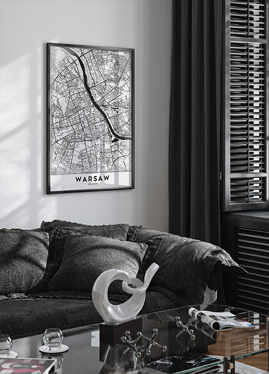 Discover Warsaw in striking monochrome: a minimalist city map where the Vistula River sweeps through crisp lines, threading bridges, boulevards, and leafy parks. Śródmieście and Praga emerge in elegant contrast, with Old Town contours and modern avenues forming a refined urban statement. A precise grid meets winding streets along the river.