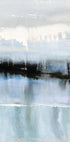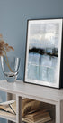 Evoking calm winter shores, this minimalist waterscape by artist Mareike Böhmer layers soft indigo and slate washes across a glassy lake beneath drifting clouds. Subtle gradients, airy negative space, and delicate reflections create a Japandi harmony of stillness, texture, and light. Perfect for serene, modern interiors.