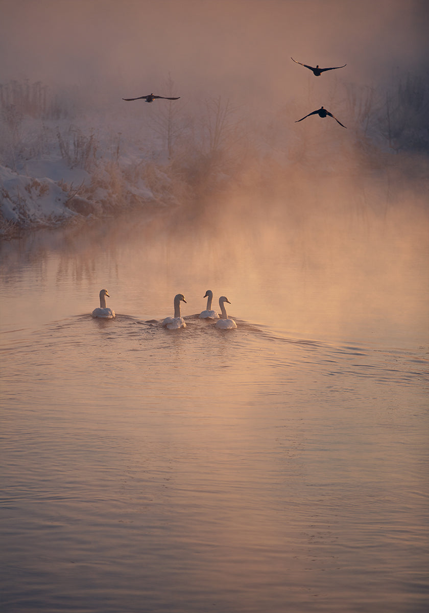 Where the Fog Didn’t Reach by Oskar Ulvur portrays a hush of winter as two swans glide over a mirror-still lake, right where the mist thins and dawn light blooms. Gentle bokeh, feathered wings and silver reflections lend a painterly calm, summoning silence, tenderness and a breath of wild distance and quiet stillness.