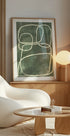 Looping lines sweep through layered greens, an abstract landscape where motion meets calm. Soft textures and organic curves hint at paths, rivers, and foliage, inviting the eye to wander. Minimalist yet expressive, this modern piece brings serene energy and balanced rhythm to contemporary interiors. Perfect for calm, creative spaces.