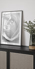 A delicate close-up of a white rose adorned with dewdrops, capturing its purity and elegance in monochrome. This timeless floral poster adds a soft and sophisticated touch to any interior.