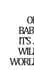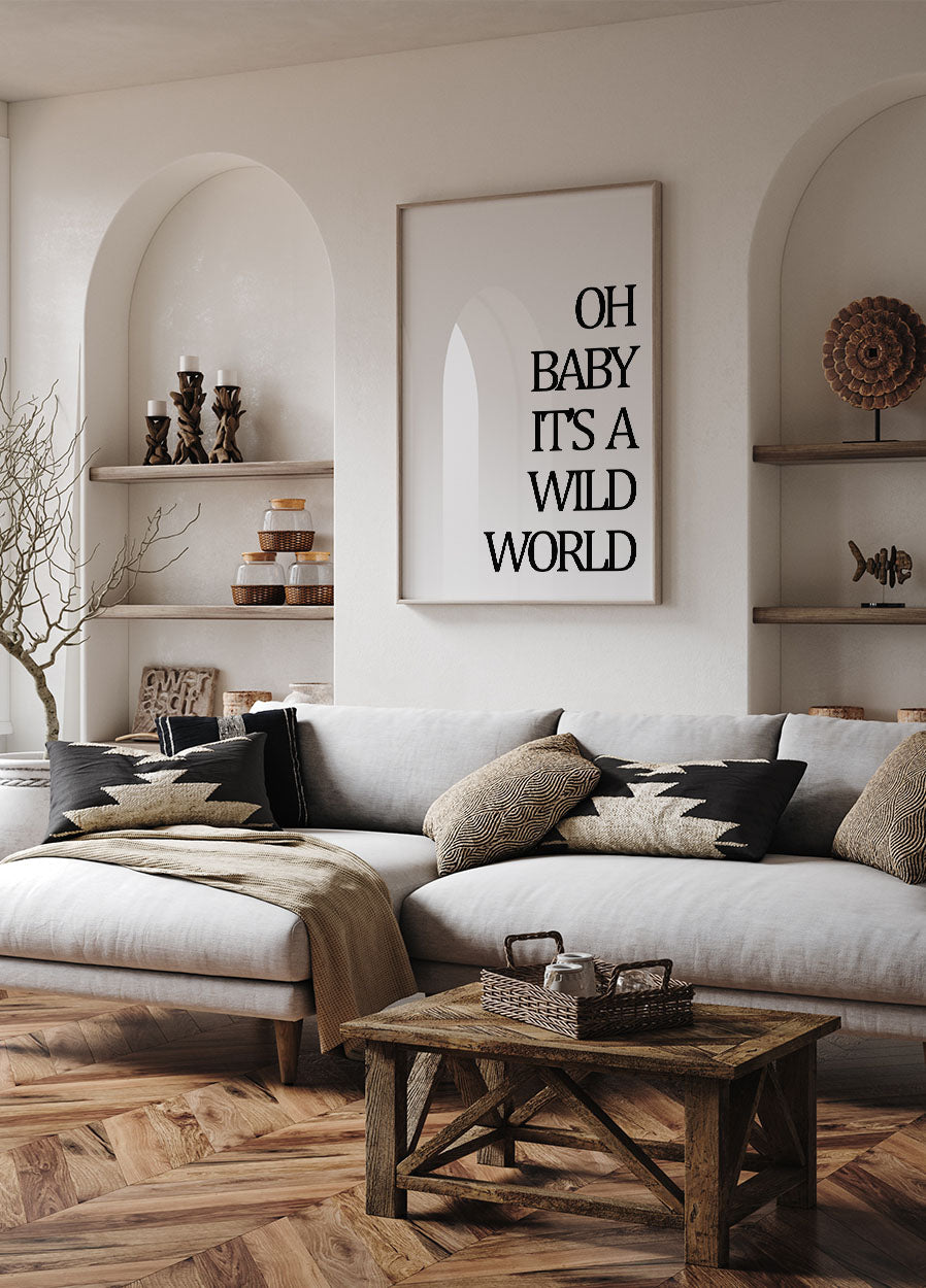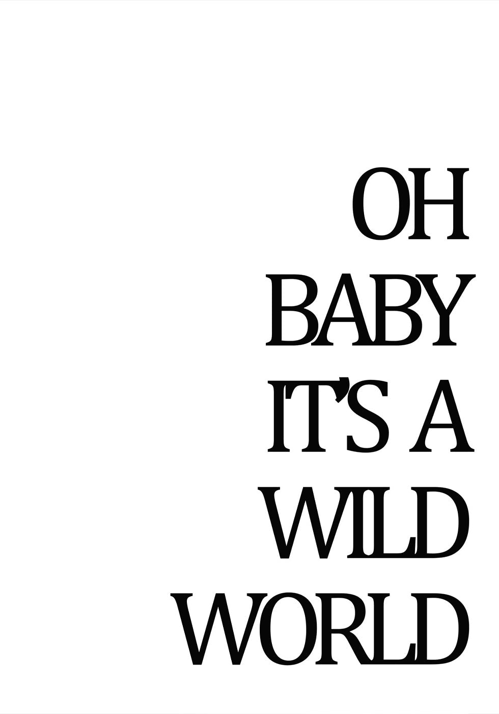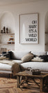 The poster features a minimalist design with a stark white background and bold black typography. The phrase "OH BABY IT'S A WILD WORLD" is prominently displayed in an eye-catching, stacked format. This design conveys a sense of adventure and excitement, emphasizing the unpredictability of life in a contemporary artistic style.
