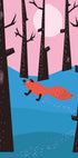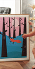 Discover Winter Fox by Nicholas: a whimsical, geometric red fox poised in a silent snowy forest. Pastel pinks and icy blues glow under a crescent moon, while slender trees and soft shadows evoke hush and wonder. Minimal yet playful, it brings woodland magic to nurseries and modern spaces. Perfect for cozy winter vibes all year round.