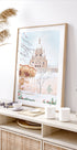 Snow hushes Montmartre as the Sacré‑Cœur rises in soft whites and cool greys, crowned by a pale winter sky. Streetlamps glow, rooftops frost over, and quiet footsteps lead toward the basilica. This atmospheric Paris scene, illustrated by Petra Lizde, distills the city’s serene, spiritual side. A quiet ode to winter wanderers.