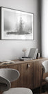 Drifting fog softens a snow-laden mountain forest in this moody black-and-white scene by artist Jivko Nakev. Layers of pines fade into haze, summits veiled in winter light, evoking silence, depth, and calm. A minimalist, tranquil composition that invites slow looking and brings wintry serenity to any space.