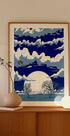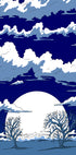 Under a deep blue winter sky, a luminous full moon rises over a quiet, frozen valley. Bare trees carve delicate silhouettes against drifting clouds, while soft gradients and minimalist forms evoke calm and wonder. A serene, stylized nightscape by Nicholas, perfect for tranquil, modern spaces. Add a touch of lunar magic.