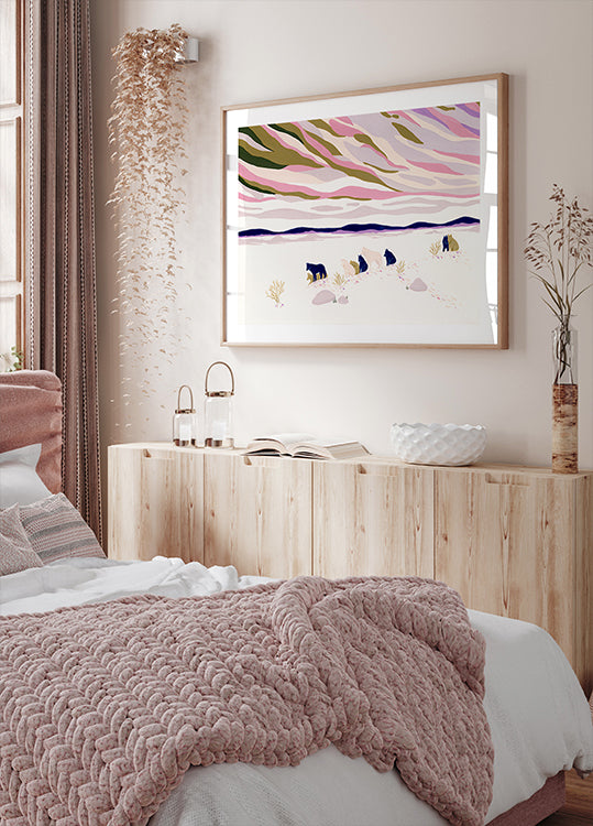 Julie Lesouef’s evocative illustration shows a pack of wolves crossing a snowy valley at sunset. Navy shadows meet blush and violet skies while mountains stand watch. Gouache textures glow softly, blending wild momentum with winter hush to create a scene of serenity, mystery, and quiet strength and wonder.