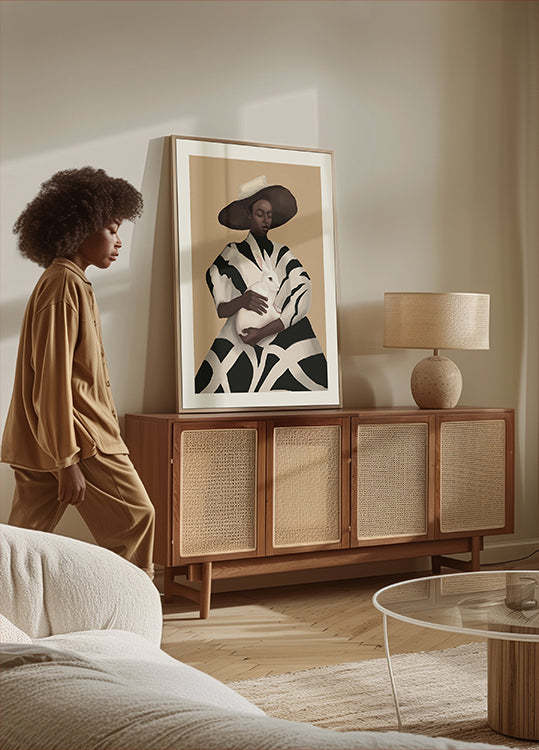 An elegant portrait by Nadjaa: a woman in bold black-and-white stripes gently holds a white rabbit, her calm gaze balancing tenderness with graphic punch. Minimal, modern, and quietly surreal, the composition contrasts crisp lines with soft fur, creating a timeless focal point for serene, stylish spaces.