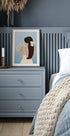 A serene illustration featuring a woman with long, flowing brown hair tied with an elegant cream bow. She holds a bouquet of daisies, her gaze softly lowered in peaceful contemplation. The soft pastel blue background enhances the gentle, dreamlike atmosphere, making it a perfect addition to spaces seeking tranquility and grace.