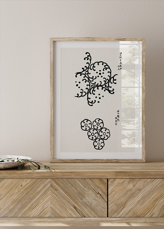 This black and white print features elegant Japanese floral and wave-like motifs, originally created for kimono textiles. Designed by Taguchi Tomoki, the print’s fine linework and circular rhythm bring a sense of refined heritage to any space.