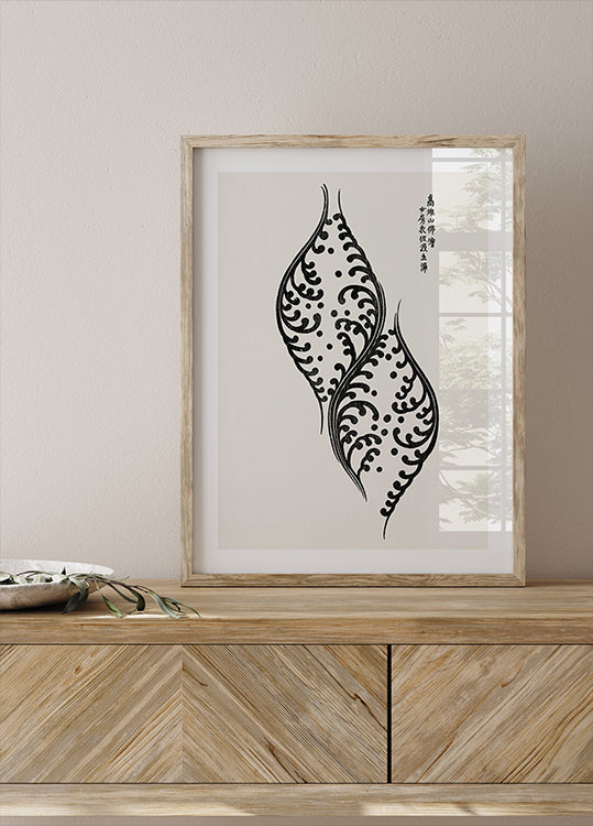 A beautiful monochrome artwork by Taguchi Tomoki, this print features a flowing, abstract camellia motif inspired by historical textile designs from the Yatsuo region. Ideal for minimalist interiors that celebrate Japanese heritage and organic form.