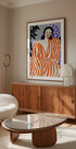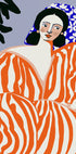 Zebra Elegance captures a poised woman styled in bold zebra stripes, framed by graphic florals and clean lines. A pop-art palette of vivid blues and oranges electrifies the scene, blending fashion and illustration into a modern portrait that feels both playful and sophisticated, striking and serene. With effortless flair.